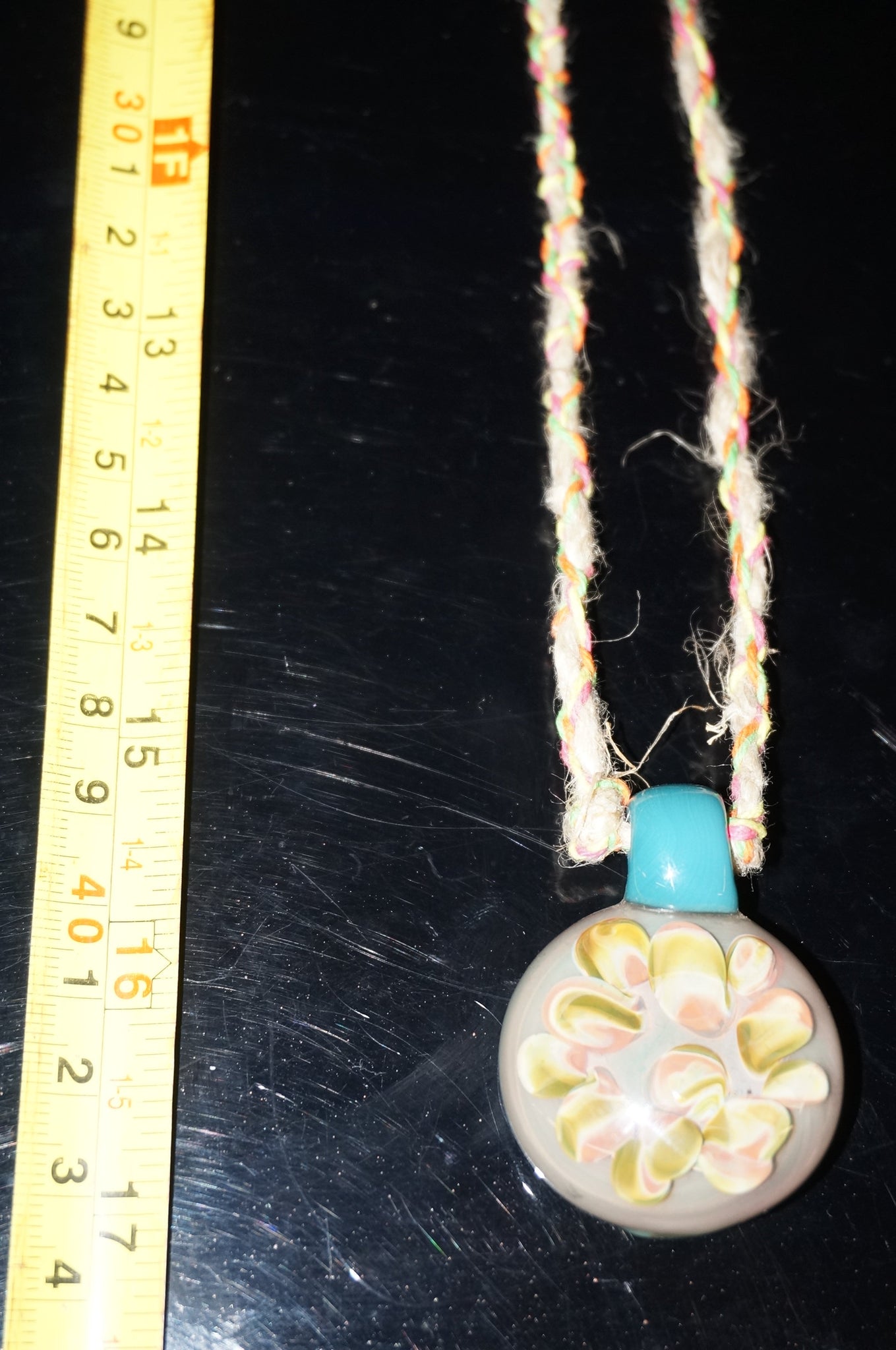 Handmade by an Ohio glassblower, simple hemp chain, depending on the source and quantity of light, the color of the glass pendant may vary in intensity as you can see in the photos.